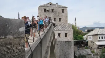 Wir stehen am Ufer der Neretva, just unterhalb der berühmten Brücke Stari Most. Es ist Mitte September, wir stehen in einem Pulk von Touristen. Da oben, knapp 20 Meter Richtung Himmel, steht ein junger Mann auf dem steinernen Geländer der Brücke. Er wird gleich herunter springen. Und deshalb sind wir hier; darauf warten wir. Der Mann da oben wird aber erst springen, wenn er sich dafür ausreichend bezahlt fühlt. Tatsächlich geht jemand hinter seinem Rücken auf und ab und sammelt Geld ein. Den Mann, der mir das erklärt, in fließendem Deutsch mit einem bosnisch-rheinischem Einschlag, bezahle wiederum ich für seine Erklärungen. Indem wir eine halbe Stunde hier stehen, sehen wir viel Geld seinen Besitzer wechseln. Aber es sind kleine Summen, und die Ware, um die es geht: der Sprung in die Neretva, der kurze Nervenkitzel – sie ist schon das prominenteste Gut der Stadt Mostar, das sie an Fremde zu verkaufen hat. All dies gibt zu denken.